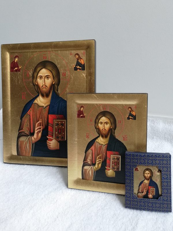Icoană Mântuitorul cu foiță de aur disponibilă în 5 dimensiuni: 5/6cm (cu magnet), A6, A5, A4, A3.